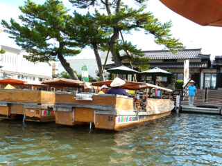 ぐるっと松江堀川めぐりは約50分で松江城を囲む堀を巡る遊覧船です。低い橋を通過するときは屋根が下がります。「歴史区」では「松江城天守」、「武家屋敷」など、「自然区」では静けさの中に水鳥、「市街地区」では「日本銀行松江支店」だった建物等が見られます。