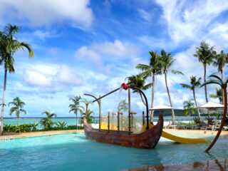 クラウンプラザリゾートグアムで迎える最終日の様子を紹介。クラブエクスペリエンスで楽しむ朝食や、静かなプールとビーチでのんびり過ごす時間、青い魚が集まる珊瑚の海でのシュノーケル体験、SUPの無料レンタル、14時までの無料レイトチェックアウトなどの紹介です。